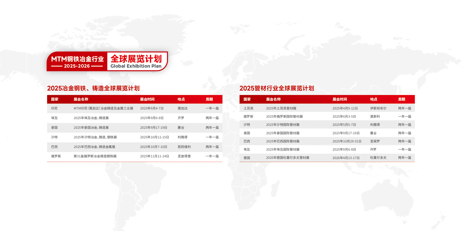 MTM金属世界博览会源自创办于1986年的上海国际冶金工业展览会。经过30多年的发展,形成了冶金展、耐火材料展、铸锻造展、钢管工业展、金属线材展、工业炉热工展、有色金属展七大主题展的钢铁冶金全产业链一站式采购平台。2025年,MTM金属世界博览会将以“科技创新、绿色低碳、智能制造、高效集约” 为主题,聚焦未来钢铁产业发展变革之路,分享行业技术创新成果与实践。为全产业链可持续发展增添动力。